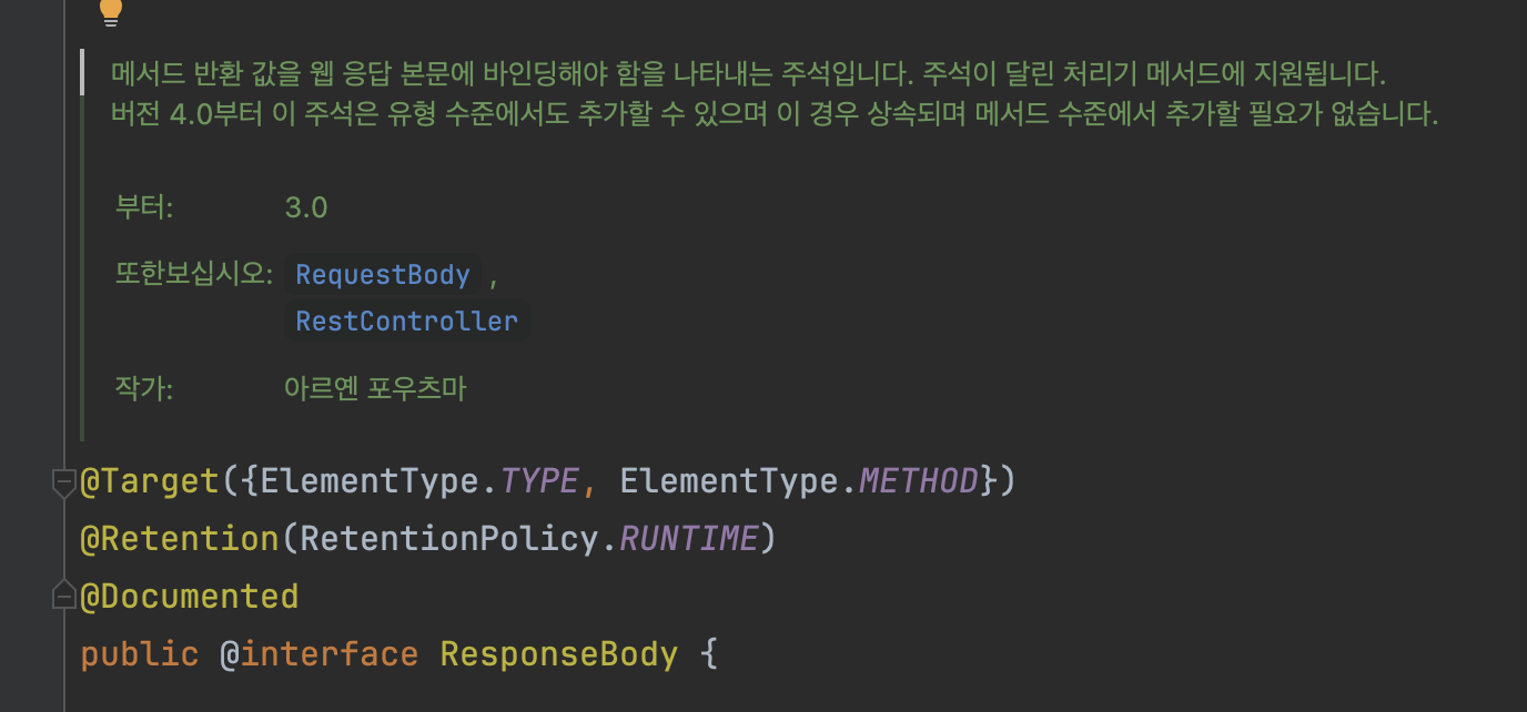 스프링에서 제공해주는 @ResponseBody 어노테이션입니다.