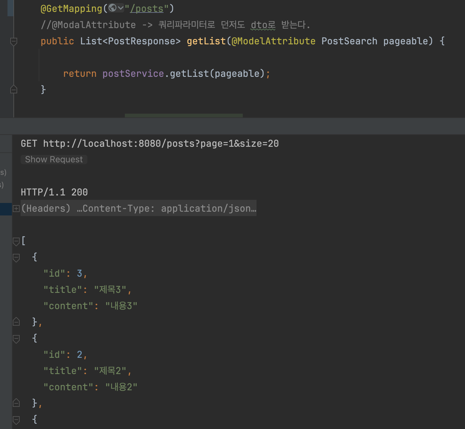 @RestController 설정된 컨트롤러에서 POJO DTO의 리스트를 요청해보겠습니다.