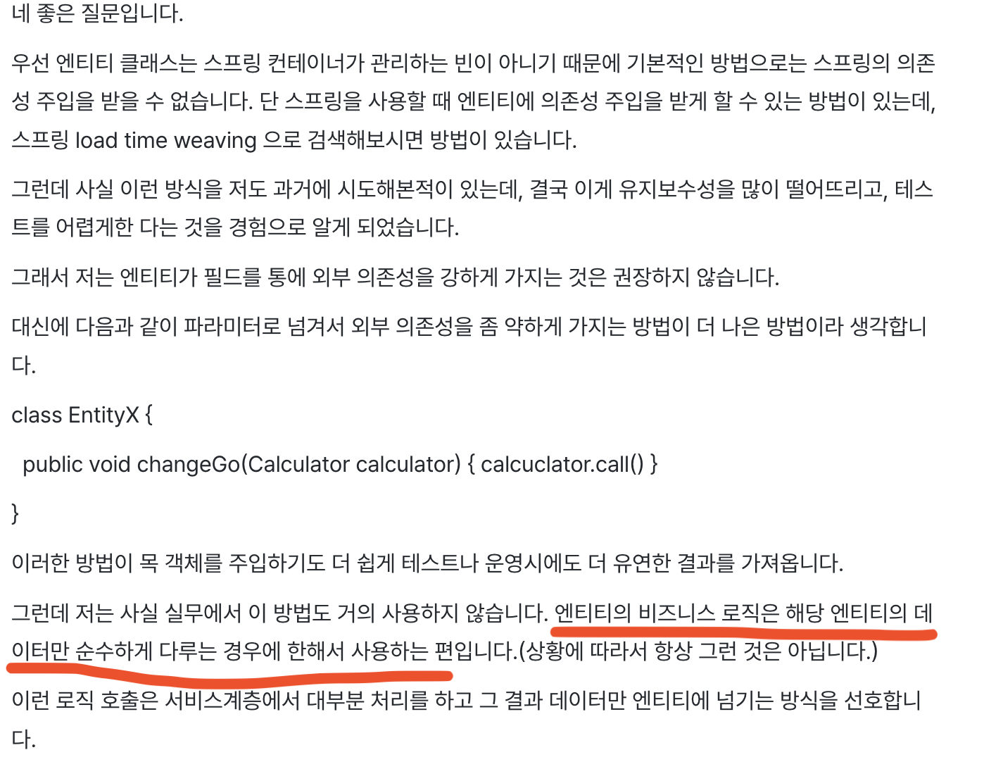 엔티티는 빈을 필드로 주입 받기 어렵고, 파라미터를 통해 빈을 받을 수 있으나 추천하는 방식은 아닌듯 하다.
